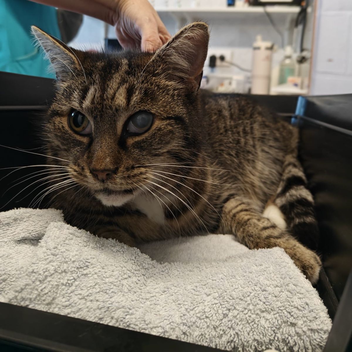 Duidelijk een ouder katje met een opvallend linker oogje (grijze schijn)