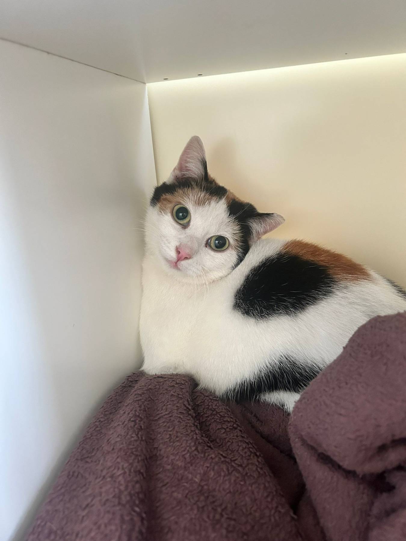 Joyce is nog bang maar laat zich wel vlot benaderen. Ze houdt ook van wat lekkers en laat zich hier wel mee omkopen! Joyce is op zoek naar een rustige thuis met geduldige baasjes die haar alle tijd willen geven om open te bloeien. We zijn voor haar op zoek naar een thuis met een andere kat en waar ze ook naar buiten mag.