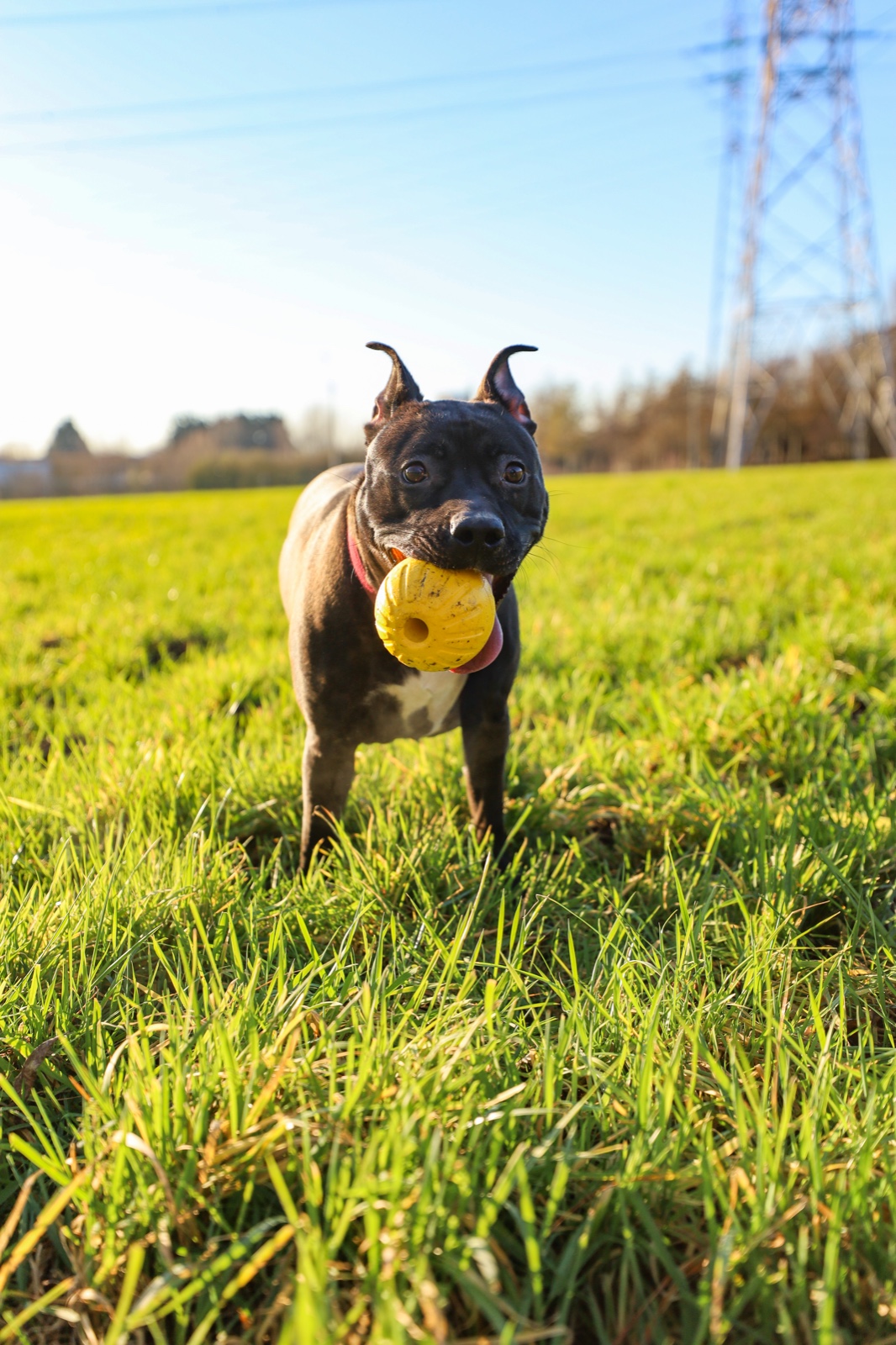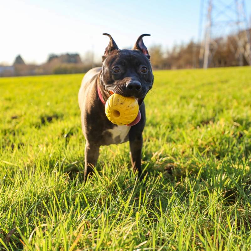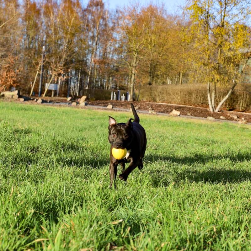 Xena is een jonge, actieve dame die veel beweging nodig heeft. Het is een bom energie die dolgraag speelt. Ze is super lief maar kan wel nog opvoeding gebruiken. Zo springt ze nog enorm veel op en durft ze hierbij, in al het enthousiamse, wel nog happen. Ze kan bij iets oudere kinderen die honden gewoon zijn, voor de kleinste is ze iets te onstuimig. Alleen thuisblijven is geen probleem, ze is ook een bench gewoon.