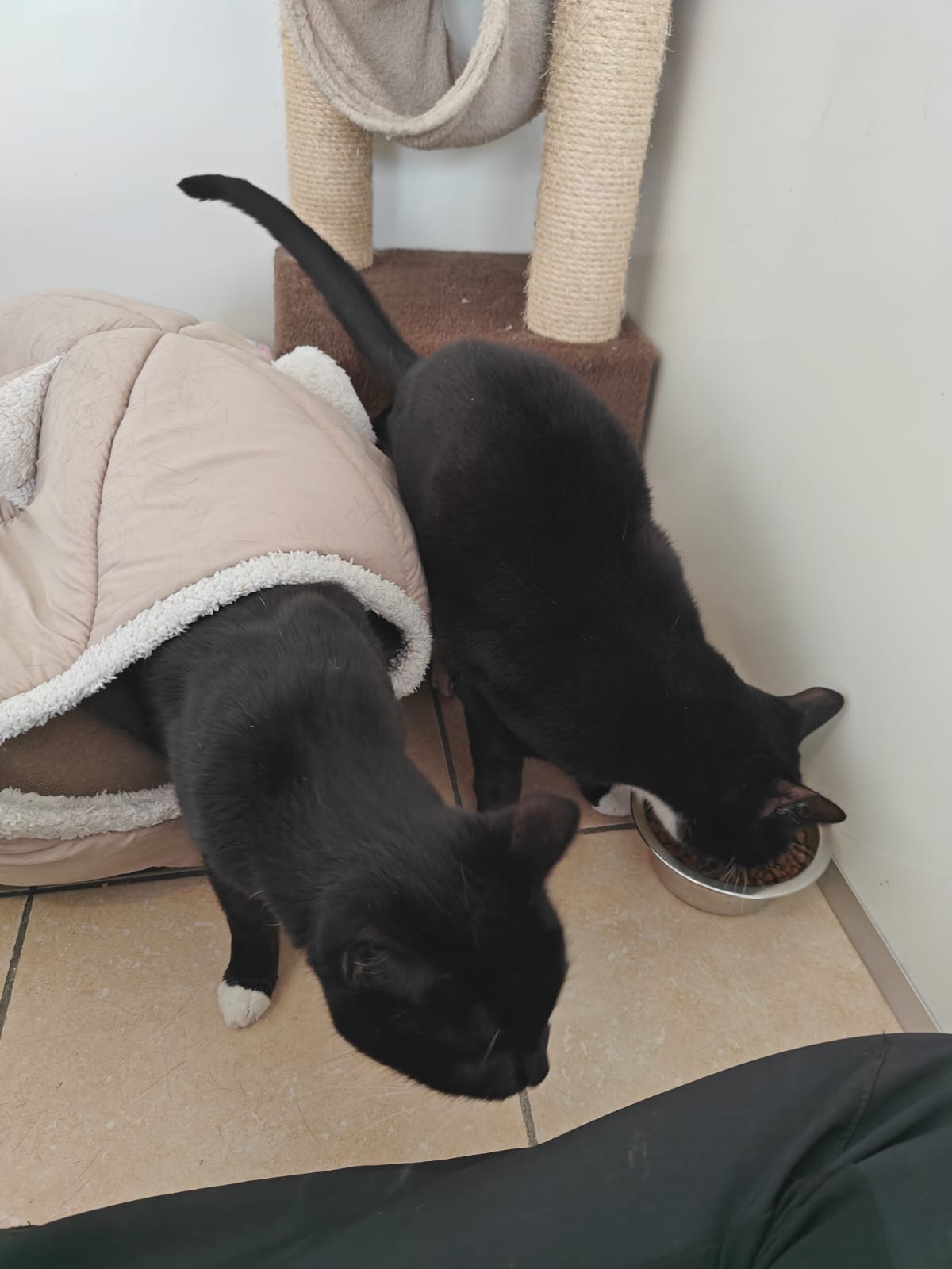 Lea en Cj kwamen binnen omdat hun baasje van werk veranderde en niet voldoende tijd meer had om aan hun te geven die ze verdienen. Het duo is vrij gelijkend van karakter; rustig, maar eens het rustig is komen ze maar al te graag kijken voor knuffels. Dit doen ze op een zachte, rustige manier zodat je helemaal mee 'zen' wordt. Eens ze in hun element zijn krijgen ze maar niet genoeg van flodderen. Ze hebben in hun vorige thuis altijd binnen geleefd dus kennen het nog niet om buiten te gaan. Dit mag natuurlijk wel, maar is geen behoefte.